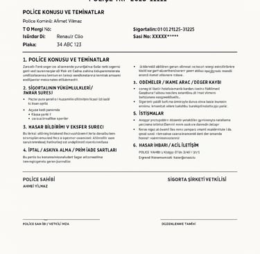 Yukarıdaki metinler örnek şablondur. Gerçek poliçe metinleri sigorta şirketinin resmi dokümanı olup, hukuki bağlayıcılığı sadece şirketin düzenlediği poliçe metninin kendisinde vardır.