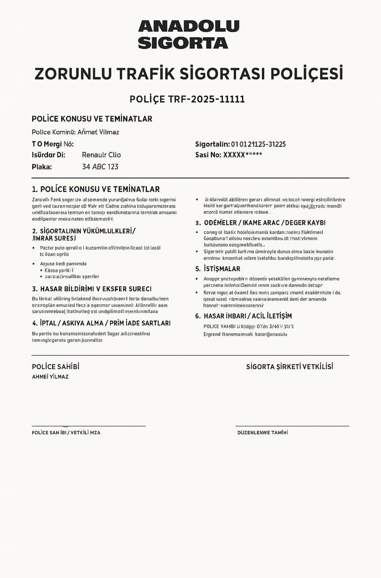Araç 1: Anadolu Sigorta – Poliçe No: TRF-2025-11111 – Geçerlilik: 01.01.2025 – 31.12.2025
