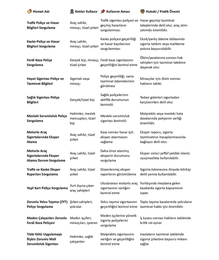 👉 Bugün e-Devlet üzerinden erişilebilen “Trafik Poliçe ve Hasar Bilgileri Sorgulama”, “Eksper Raporu Sorgulama”, “Kasko Poliçe Bilgileri” gibi hizmetlerin tamamı SBM tarafından sağlanmaktadır.